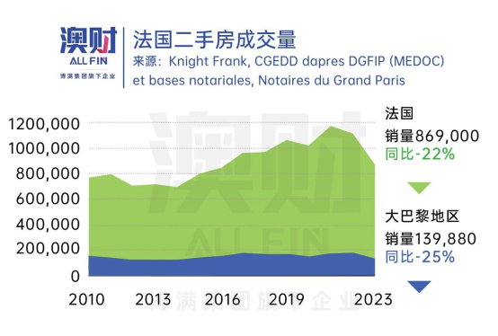 截止到2024年第一季度,法国房价同比下跌5.2%,环比下跌1.6%;2023全年房屋成交量同比下跌22%,且跌幅仍在继续。不仅如此,巴黎还出现了房产供应严重过剩的情况,叠加萎靡的购房需求,房产价格可能会进一步下跌。