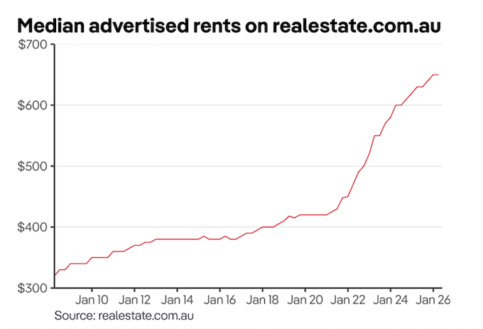 租金上涨是导致可负担性恶化的核心原因。数据显示,全国房租中位数已从2020年初的 每周420澳元 上涨至目前的 650澳元,涨幅高达 55%。仅过去一年,租金就从620澳元上涨至650澳元,尽管增幅约5%为近年来最低,但仍超过收入增长水平。各地涨幅差异明显,其中西澳表现最为突出。珀斯租金几乎翻倍,从疫情初期的每周360澳元上涨至约700澳元。布里斯班及昆士兰偏远地区同样涨势强劲,周租金中位数分别上涨约270至280澳元。阿德莱德租金也较疫情前上涨约60%。