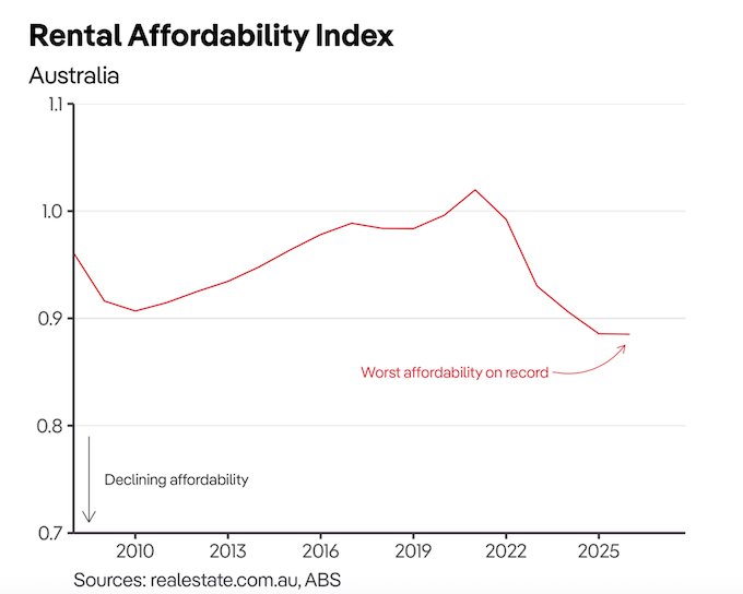 最新数据显示,澳大利亚租房压力持续加剧,租房可负担性已降至至少自2008年有记录以来的最低水平。根据 realestate.com.au 发布的《2026租房可负担性指数》,全国租客正面临近20年来最严峻的居住成本挑战。报告指出,在过去一年中,尽管租金涨幅较此前高峰有所放缓,但整体租金水平依然持续上涨,超过收入增长速度,进一步压缩了租客的承受能力。2025年下半年(7月至12月),各收入层家庭能够负担的租赁房源比例降至历史最低。