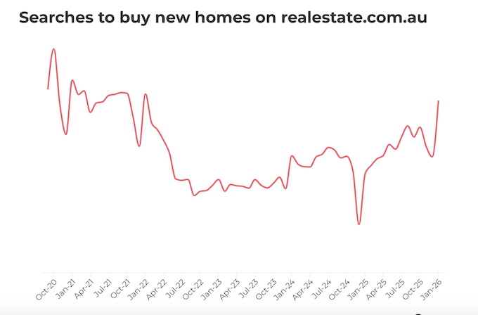 经历数年调整后,澳大利亚新房市场正显现回暖迹象。最新数据显示,购房者对新建住宅的关注度明显上升,相关搜索量已攀升至近四年来最高水平,反映出市场信心逐步恢复。根据 realestate.com.au 数据,今年1月新房板块的搜索量达到自2022年初以来的峰值,标志着购房者情绪出现明显转变。此前,由于建筑成本飙升、利率快速上行以及部分开发商倒闭等因素影响,新房市场一度陷入低迷,买家观望情绪浓厚。