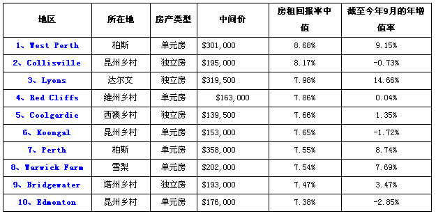 西柏斯的单元房,比澳洲其它任何地区的任何房产类型都更能满足投资者对金钱的爱好。当地单元房中间价仅区区30.1万,但回报率却高达8.68%。榜单显示,昆州、维州、西澳和塔州的乡村小镇占据了十大明星地区中的6个,您花不到20万元,就能拥有回报率超过7%的“会下金蛋的母鸡”。但前提是,您不介意房子本身疲弱到悲惨的年增值率(至少短期内是如此)。
