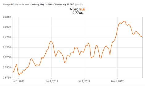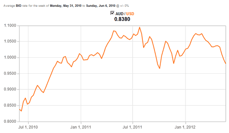 在2010年11月,澳元和美元等值,在2011年7月31日,澳元与美元比值达到了历史最高的1.0945。但自从2012年4月底起,澳元就开始下跌,与美元比值从1.04下降到0.98。