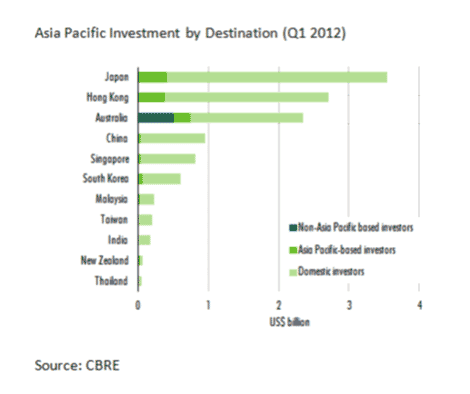 Jones Lang LaSalle数据显示,2012年第一季度澳大利亚对办公楼,零售和工业的投资总量达20.8亿澳元,与此相比,2011年同期只有14亿澳元。这段时间,澳大利亚对海外投资者来说是几个首选投资目的地之一,仅次于日本和香港。