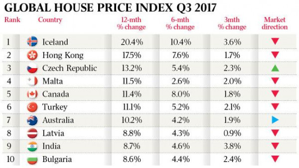 冰岛以20.4%的增长位居榜首,其次是香港为17.5%,捷克共和国为13.2%,马耳他为11.5%,加拿大为11.4%。