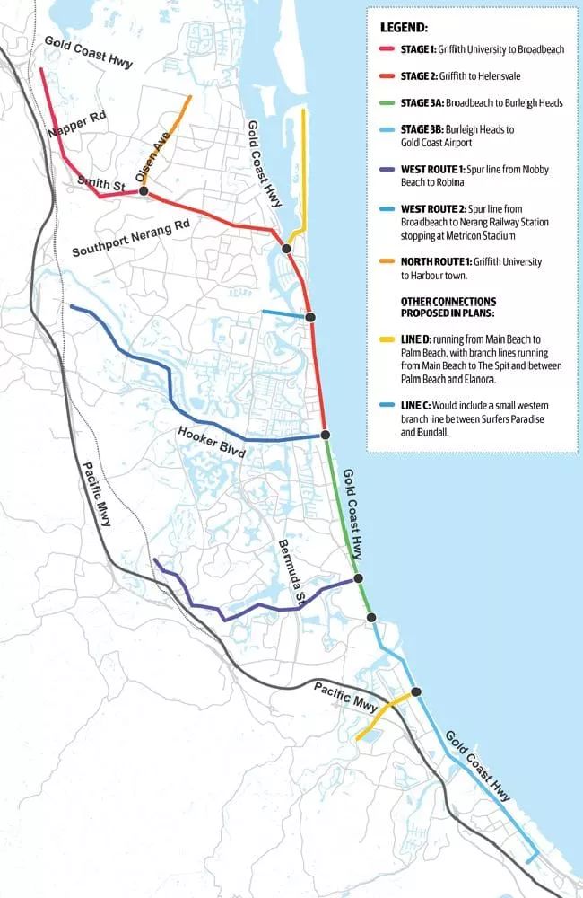 - Stage 1: 布罗德海滩至格里菲斯大学 - 2014年完工并运营