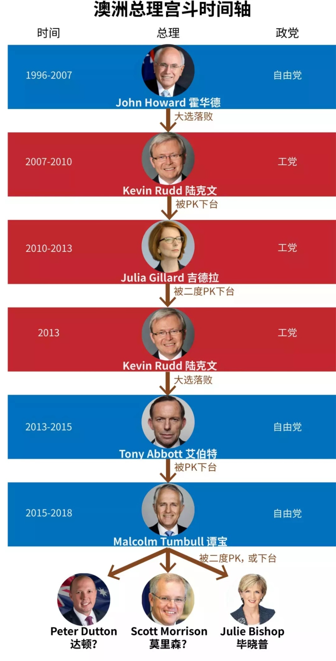 BBC还给澳大利亚封了一个“政变之都”的头衔!11年7个总理可不是闹着玩的!澳洲人民可能一觉睡醒,这个国家的领导人就已经是另一个人了。澳大利亚同样每隔几年就会举行一次全民大选,但这次大选仅是选择执政党。确立完执政党之后,执政党的党魁就顺理成章成为了澳洲总理。关键在于谁当选党魁这件事,却很“反复”了。很多时候屁股都没坐暖,就被“逼宫”下台了。从2010年开始,澳洲的政坛就一直风起云涌,总理说换就换,就没有当满过任期,现在来梳理一下近年来的“宫斗”大剧。