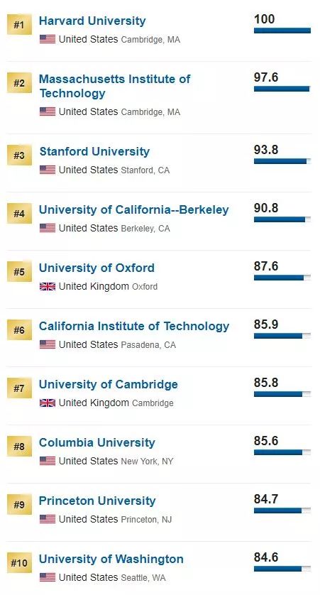 本次排名和去年相比变化不大,冠亚季军依然由哈佛、MIT、斯坦福大学包揽。前十名中依然是除了英国的牛津和剑桥这两所老牌大学入围,其他都是美国的学府。