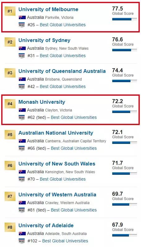 墨尔本的其他几所高校的表现也有着不俗的表现。