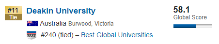 迪肯大学澳洲第11名,全球第240名。其中计算机科学(Computer Science)排至全球第84名。