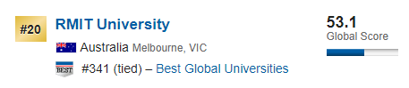 RMIT澳洲第20名,全球第341名。其中工程专业(Engineering)排至了全球第71名的好成绩。