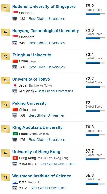 亚洲区的第一名由新加坡国立大学夺得。清华和北大分别是亚洲的第三和第五名。本次清华大学进步也较大,一跃进入了世界前50的行列。