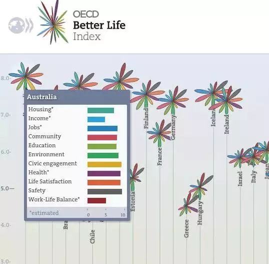 经济合作与发展组织(简称OECD)2013年发表的“更好生活指数”报告,对34个成员国的民众生活品质作出评估。最令人惊讶的是澳洲自2011年连续三年成为OECD成员国中生活品质最好的国家。