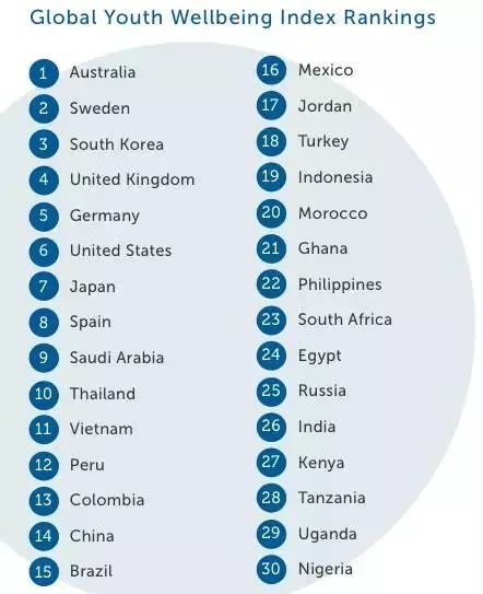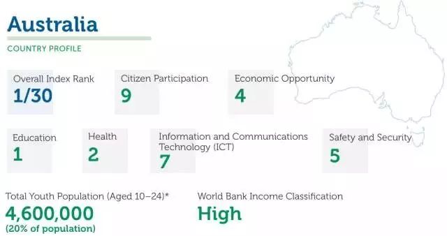 2014年,美国和国际青年基金会共同调查了全球青少年幸福指数(GlobalYouth Wellbeing Index),在对全球30个国家的青年人进行了调查后发现,澳洲排在全球第1位。这个结果表明澳洲的年轻人(12-24岁)幸福指数非常高,澳洲的年轻人比世界其他国家的12-24岁之间的年轻人生活得更好。