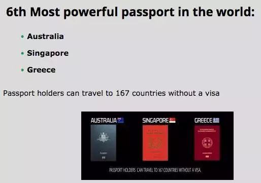 据世界旅游者网站报道,2017年最新在线护照指数评出了各国护照的“威力”。澳洲护照在这份榜单中排名第6,拥有105个免签国家,和48个落地签国家!