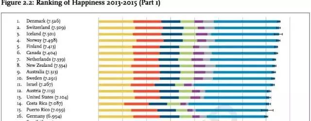 这个报告主要衡量全球158个国家国的幸福感,旨在帮助各国政府制定公共政策。它以六个因素作为对比基础,包括国民生产总值、人均寿命、生活选择自由度、清廉状况等。报告结果取的是2012-2014年调查的均值。