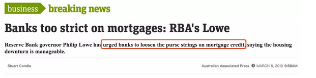 在3月6日的AFR《澳大利亚金融报》商业峰会中,澳储行行长Philip Lowe已表示过,将全力敦促澳洲各大银行放松抵押贷款的标准与控制。