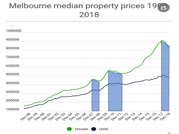 以墨尔本为例,自1998年至2018年的十年间,墨尔本楼市共经历了三个调整期。