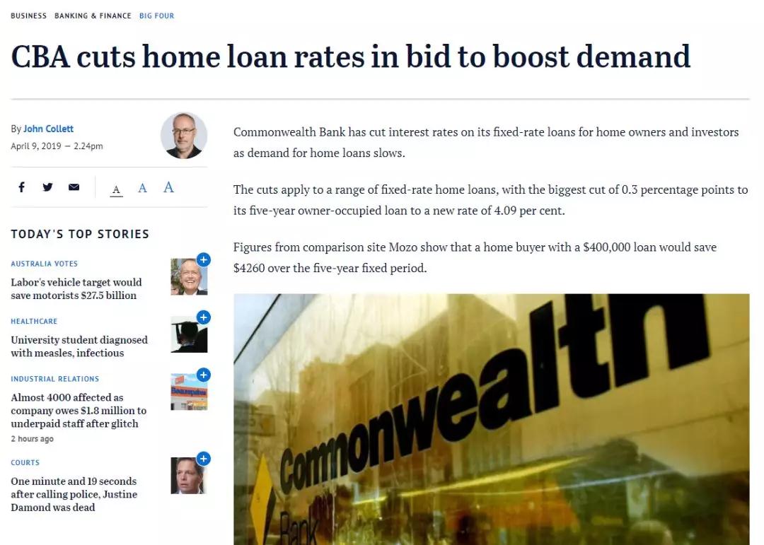 澳洲四大银行之一的CBA(联邦银行)日前宣布,下调房贷固定利率!