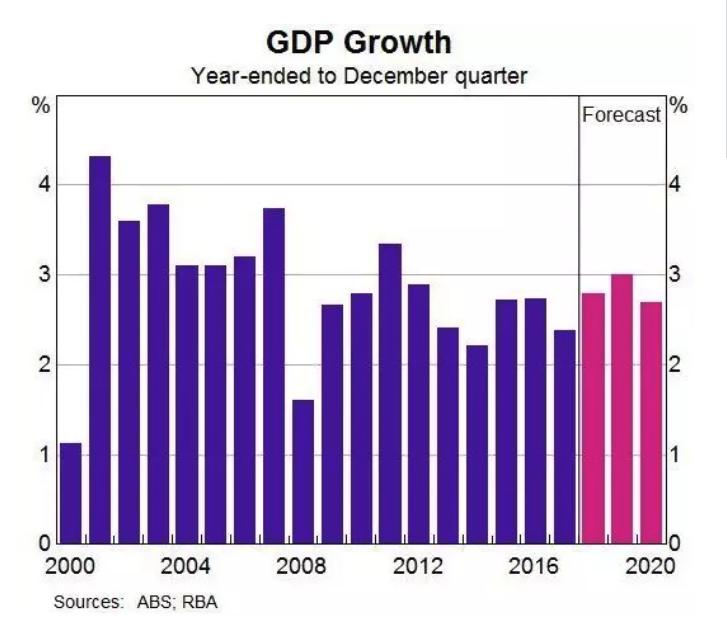 澳大利亚央行预计,2019年和2020年澳大利亚经济增长分别为3%和2.75%。