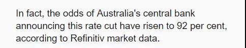 根据Refinitiv的市场数据,澳大利亚中央银行宣布降息的可能性已上升至92%。