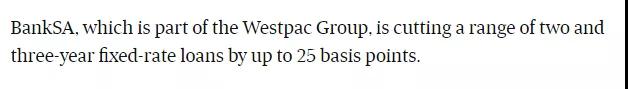 作为西太平洋银行集团(Westpac Group)的一部分,BankSA将两年期和三年期的固定利率贷款下调至多25个基点