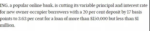 将15万澳元以上、100万澳元以下、首付20%的贷款利率下调了17个百分点,下调之后利率为3.63%。