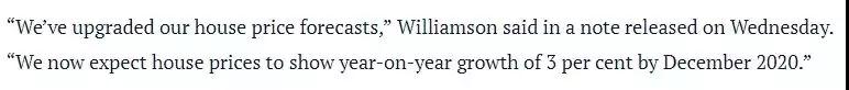 “我们调整了对房价的预测。”Williamson表示,“现在我们预计,截止2020年12月,房价将呈现出3%的年增长。”
