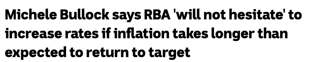 澳大利亚储备银行行长Michele Bullock 表示,由于担心通胀可能需要比当前“2025 年末”预测更长的时间才能恢复目标,央行将毫不犹豫提高现金利率。