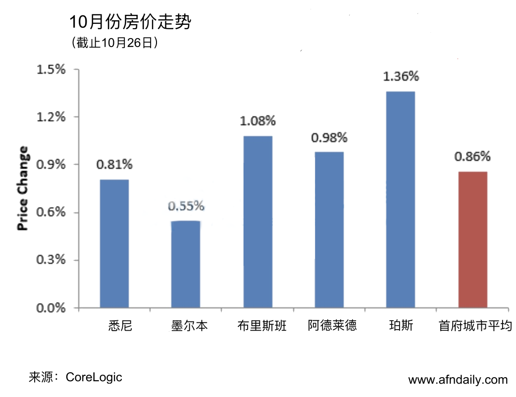 CoreLogic最新数据显示,10 月份迄今首府城市平均房价已上涨 0.86%,其中珀斯领涨,布里斯班紧随其后。
