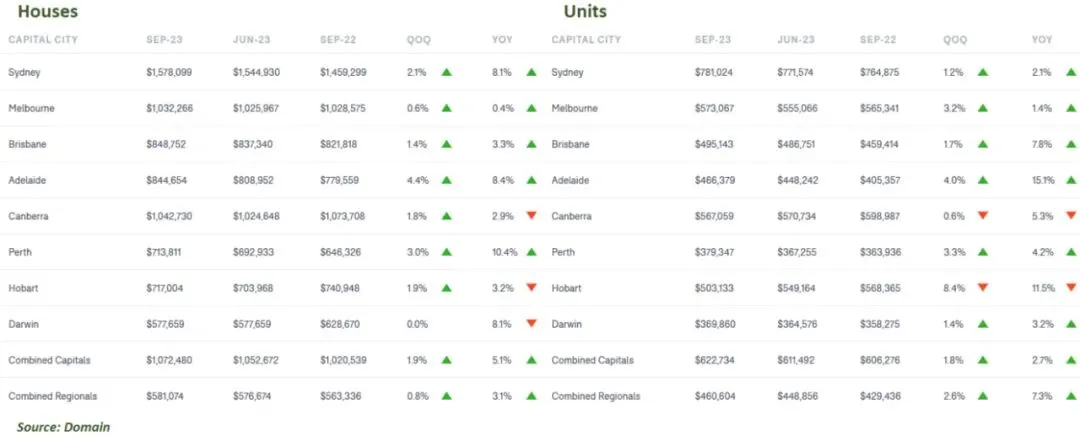 周三,Domain发布了9月季度房价结果,数据显示首府城市房价环比上涨1.9%,同比上涨5.1%,而单元房价值环比上涨1.8%,同比上涨2.7%。