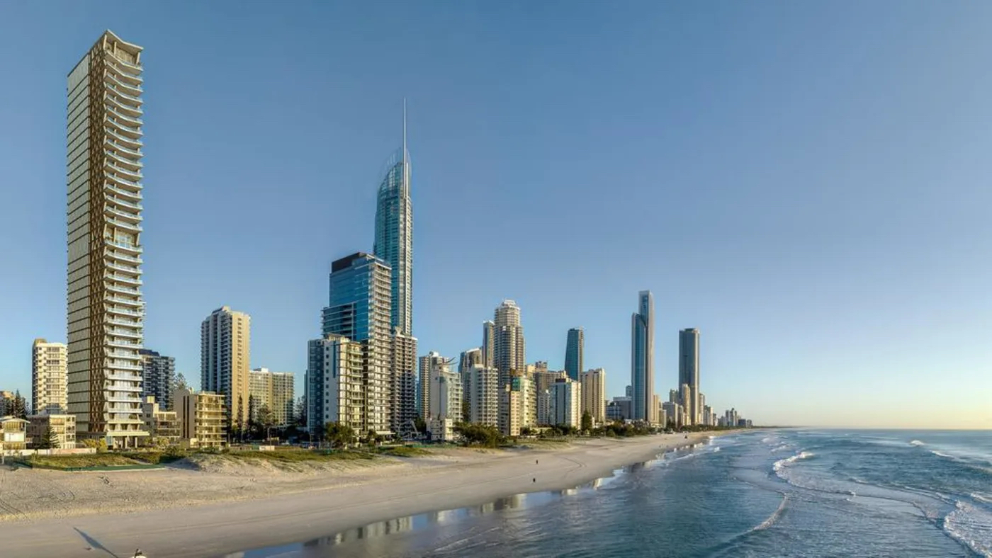 Escape是一栋价值2.5亿的公寓楼,拥有31栋全层住宅和两栋双层顶层公寓,计划位于冲浪者天堂加菲尔德露台63-65号的海滨场地。