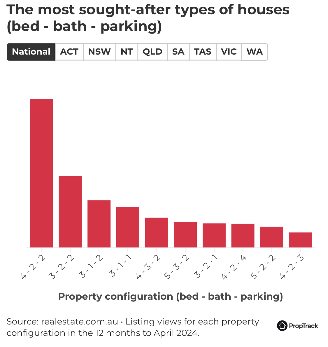 这是根据realestate.com.au的最新数据,根据卧室、浴室和停车位的数量,检查最受欢迎的家庭配置。