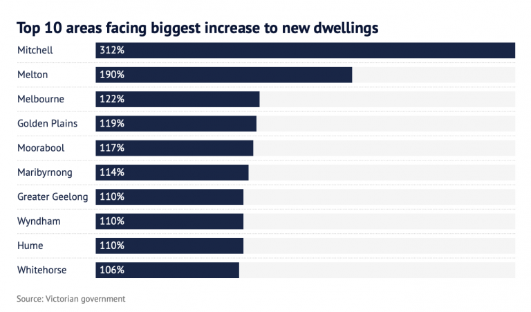 虽然一些倡导者认为州政府必须提高城市内环的中密度住房水平,但根据政府的新目标,在未来30年内,墨尔本外围市府辖区(如Melton和Mitchell)的住房数量的增长比例最大。