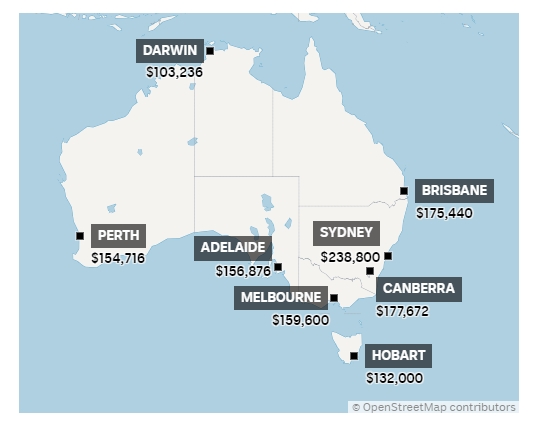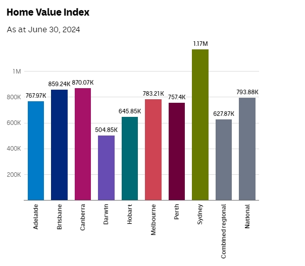 图表:澳大利亚各首府城市中间房价(2024年6月30日)