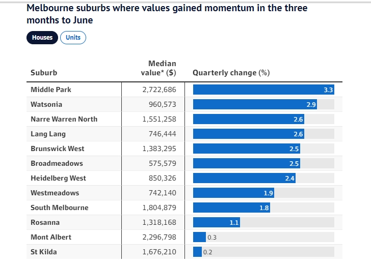 到目前为止,墨尔本内城和东北部一些中价郊区的房价在过去三个月出现反弹,尽管市场整体疲软。CoreLogic的数据显示,过去三个月,MiddlePark、St Kilda、Brunswick West、Watsonia和Keilor East的房价上涨了1.8%至3.3%,扭转了上一季度的大幅下跌。