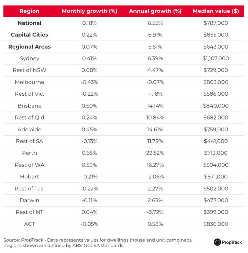 PropTrack 的数据显示,截至 2024 年 6 月的 12 个月内,全国房价上涨 6.55%,至 787,000 澳元。