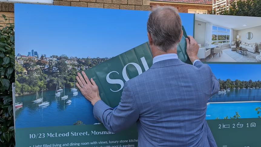 房产中介将写有已售字样的贴纸贴到房屋的出售牌子上。