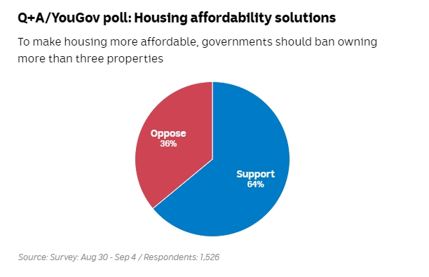 对1500多名选民的加权民调样本显示,六成多的人支持这些政策,即取消房地产投资者负扣税,禁止拥有三套以上住宅,并可以用养老公积金购房。80%的受调者希望大幅增加社会住房建设,为中等收入者提供负担得起的租金。