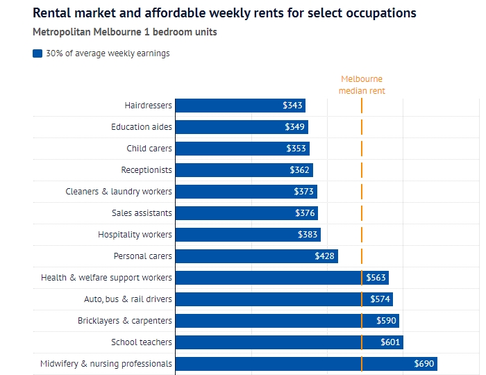 在墨尔本市区,一名独居的普通幼托工作者要将40%以上的收入用于支付一套一居室公寓的中价租金。