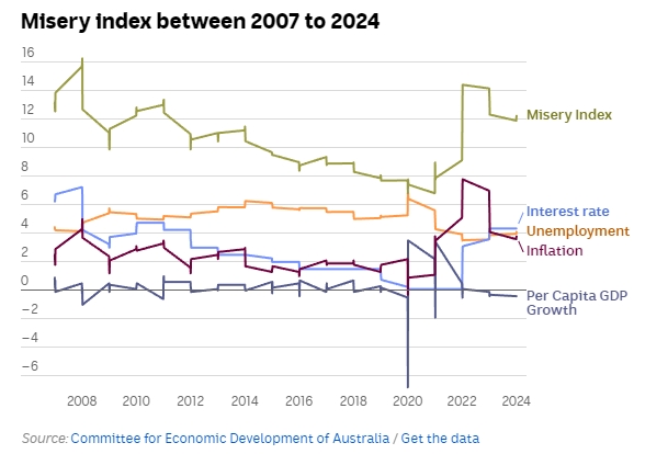 该研究调查了2007年至今年6月底的痛苦指数。分析发现,澳大利亚的经济困境已较新冠疫情后的峰值有所下降,但仍然很高。