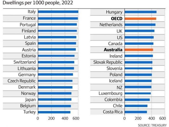根据经济合作与发展组织的数据,澳大利亚在每千人住房数量方面,在33个发达国家中排名第23位。过去十年来,澳大利亚每千人住房率从经合组织平均水平的 92%下降到 90%。