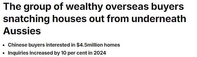 目前,富裕的中国正在悉尼北竞购豪宅,包括不受当地买家青睐的新分割地皮的房产。居外网董事总经理丹尼尔·何岸表示,咨询的前7%中国买家对澳洲房产的购房兴趣通常为450万左右,悉尼东南部Coogee或下北岸Castlecrag的房屋中位价。