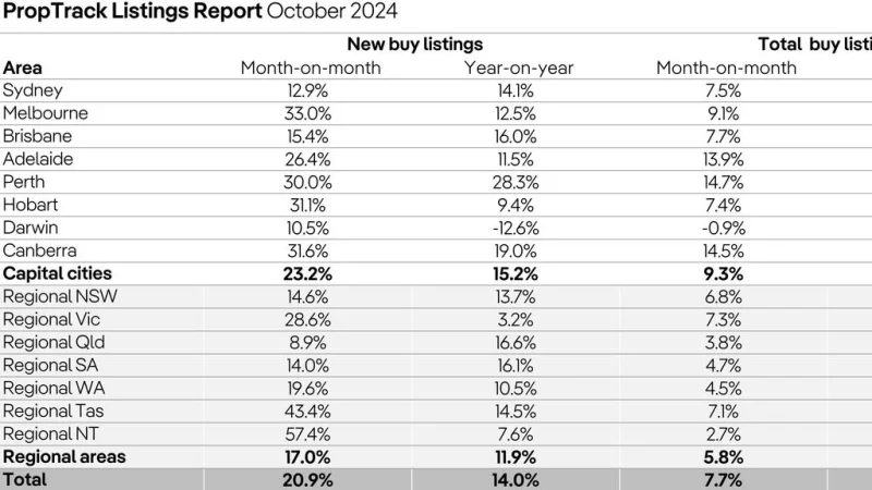 PropTrack 今天发布的房源报告得出结论,买家“选择太多”,各首府城市上市的房产数量创下了 10 年来 10 月份的最高水平,环比增长 23.2%,与 2023 年相比增长了 15.2%。