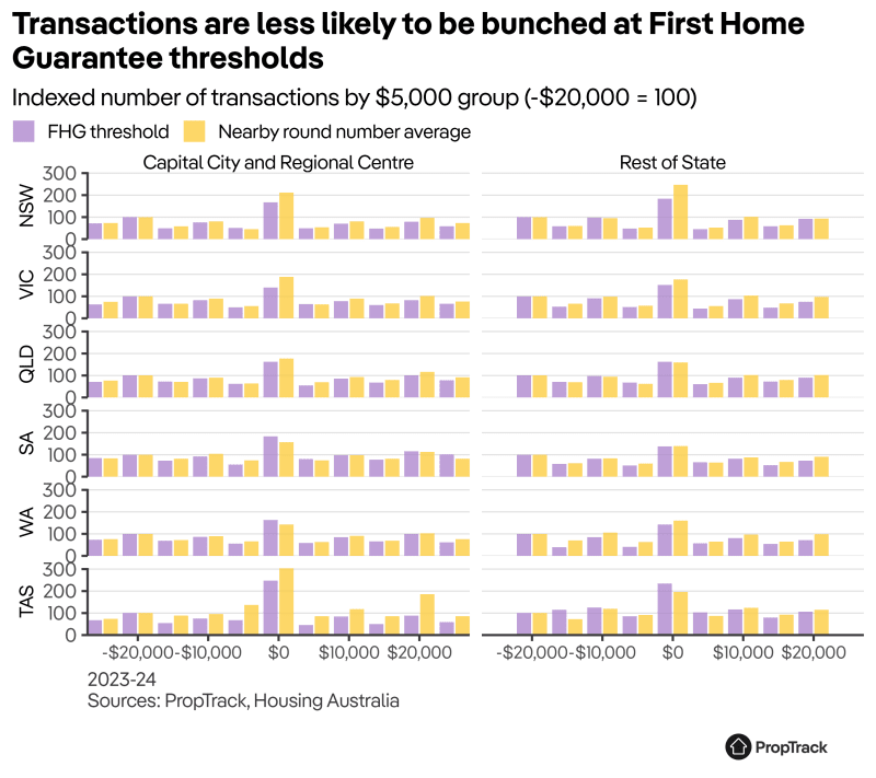 结果表明,在大多数情况下,首次置业担保门槛以下的交易集中现象比其他附近的价格点要少。唯一在担保门槛处出现更多集中现象的市场是阿德莱德和珀斯,但并不显著。