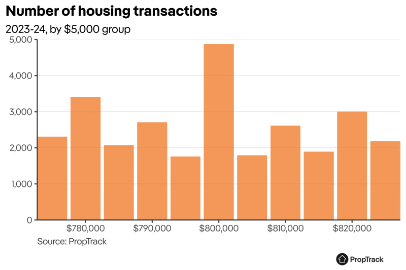 所有住房交易中,价格集中在整数点的情况很常见。例如,价格在 80 万澳元或以下(接近全国房价中位数)的交易数量几乎是价格在 79.5 万澳元左右的交易数量的三倍。