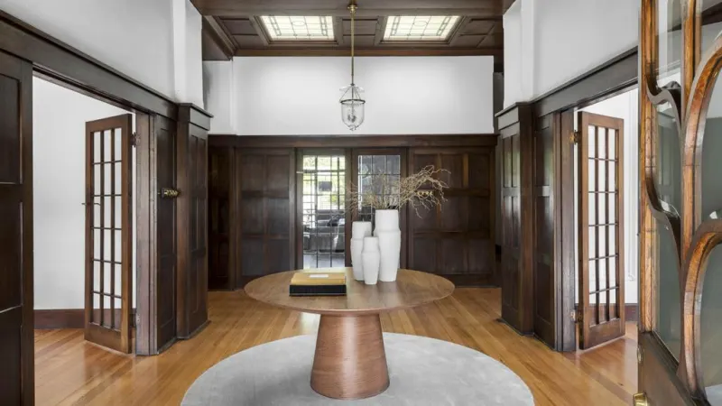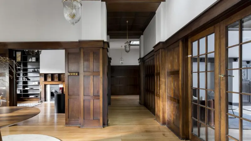 整个住宅都采用木质镶板,还有法式门、时尚的吊灯、塔斯马尼亚橡木地板、壁炉和铅灯窗。