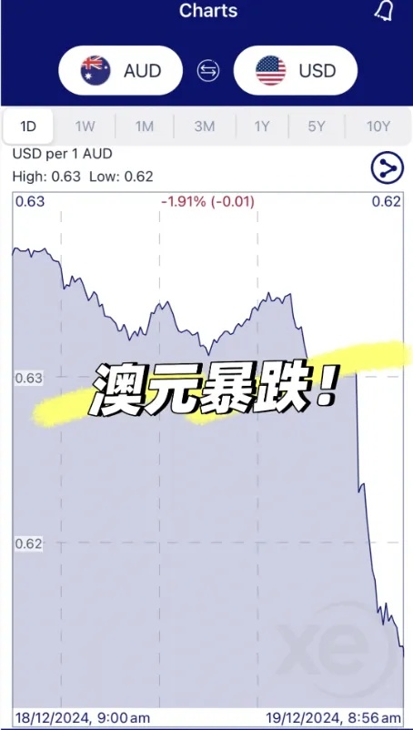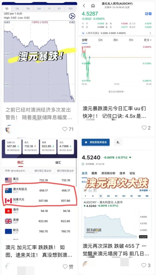 12小时内,澳币兑人民币汇率从最高的1:4.615大幅下挫到1:4.520!这是要跌穿4.5的节奏了...