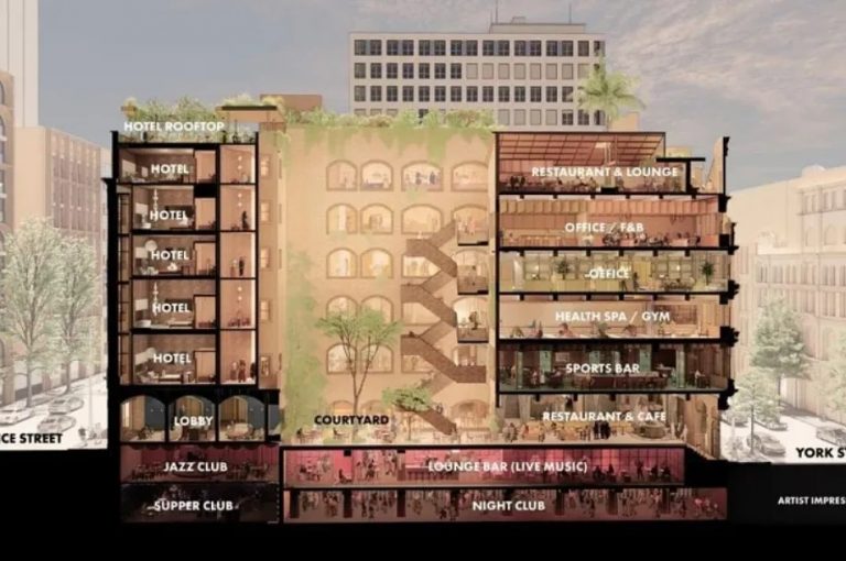 据上个月提交给悉尼市府的文件显示,他的Merivale公司计划将位于KingSt、Clarence St和York St的6栋建筑改造成一个包含酒店、地下夜总会、爵士俱乐部、夜宵俱乐部、餐厅和咖啡馆、运动酒吧、健康水疗中心、健身房、餐厅和休息室、室内庭院以及办公室的大楼。