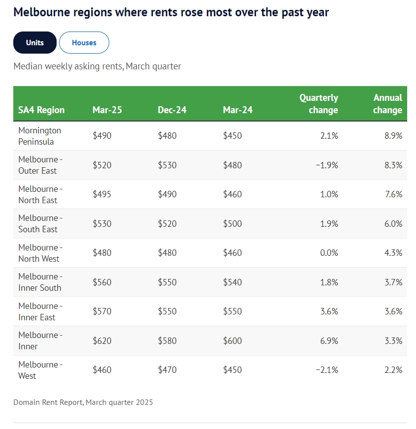 就公寓租金而言,莫宁顿半岛以北地区、外东区(每周 520 澳元)和东北区(每周 495 澳元)的年增长率均超过 7%。