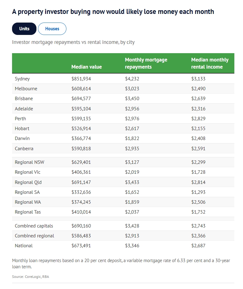 购买墨尔本一套典型公寓的人每月需支付 3023 澳元的投资贷款,但典型租金为 2490 澳元。